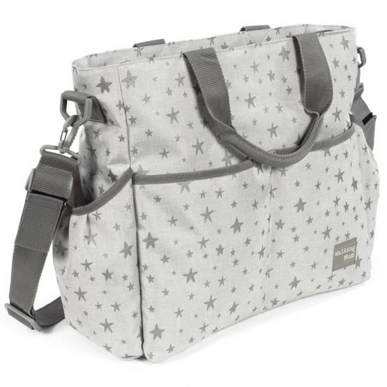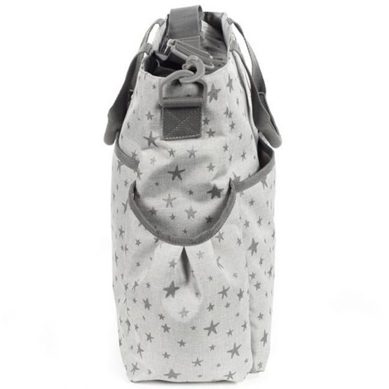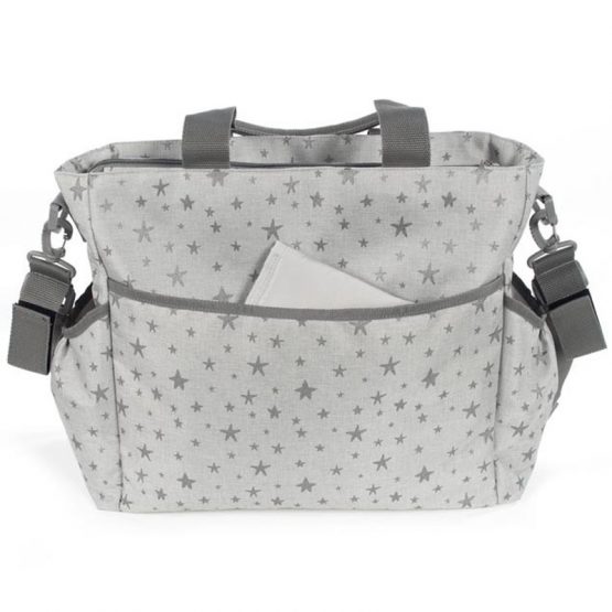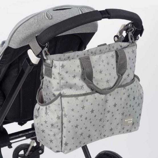 - Asa larga ajustable con sistema universal de fijación para poder llevarlo colgado al hombro. Esta misma asa incluye a su vez dos asas cortas ajustables para poder llevar el bolso colgado cómodamente del carro o la silla de paseo.