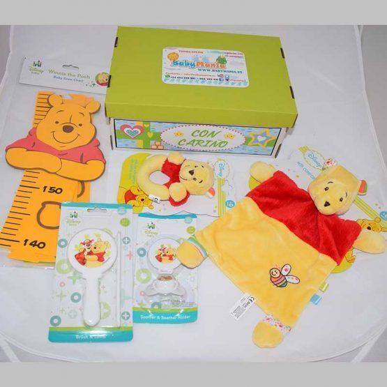 La cesta para bebés creciendo con Winnie Pooh es ideal para los amantes de Disney pero sobre todo para los que les gusta winnie pooh, pues hemos hecho en una sola canastilla una serie de productos súper chulos con diseño de Winnie. que valdra tanto para niña como para niño.