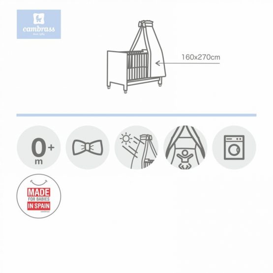 Dosel Para Cuna Cambrass incluye soporte y mosquitera para cuna, que protege al bebé de la luz, de corrientes de aire e incluso de los insectos. Fabricado en España por Cambrass.