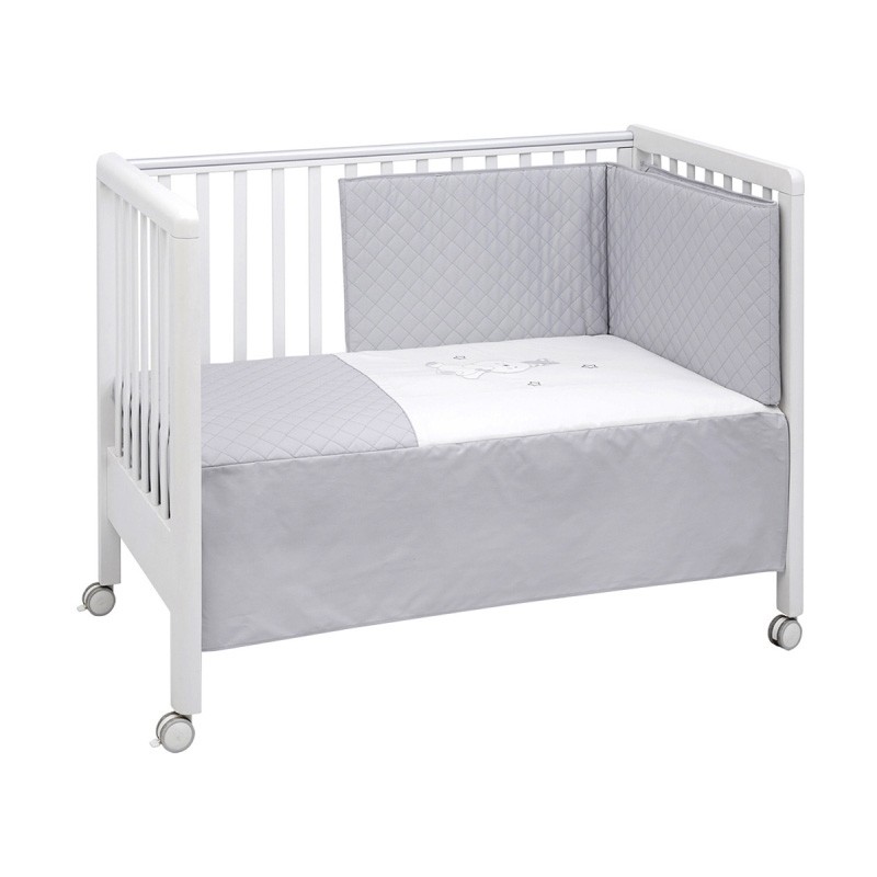 Juego de dos piezas para vestir la cuna, compuesto por colcha más protector con un bonito bordado en el centro. Fabricado en España por Cambrass.