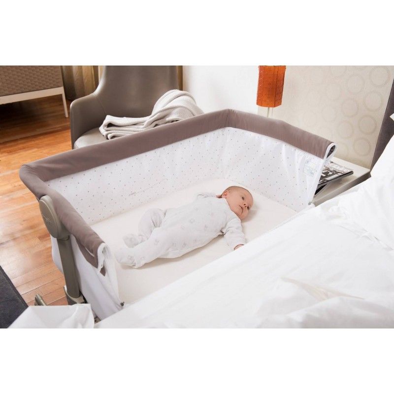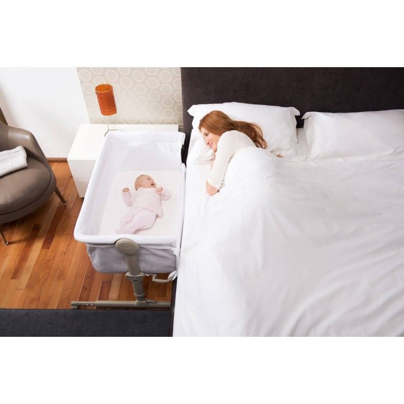 Esta minicuna se puede fijar a la cama de los padres mediante un conjunto de correas. Esto es excelente para la madre, porque de esta manera el niño está cerca en todo momento y hace más fácil la hora de amamantar durante la noche. La minicuna se puede alejar de la cama fácilmente por medio de un pedal, esto es excelente al momento de hacer la cama.