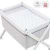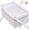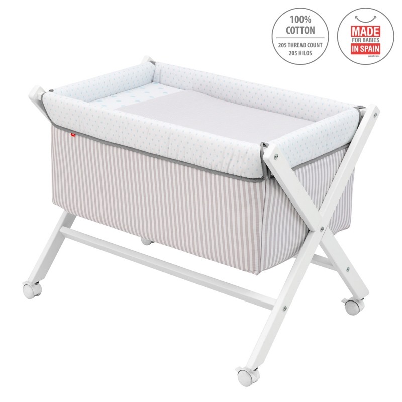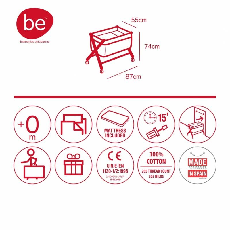 - Otros aspectos que hacen especialmente funcional esta minicuna, incluye almohada, colchón y somier de madera de 5mm, soporte de madera lacada en blanco y su vestidura cosida que incluye la colcha.