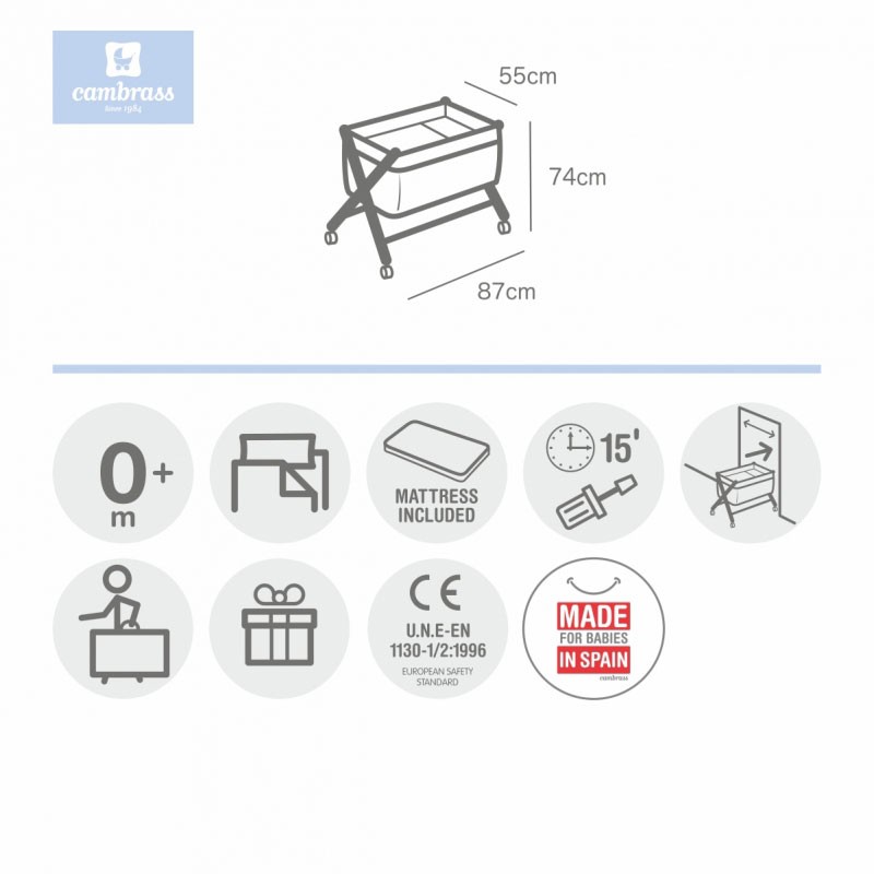 La minicuna de Cambrass modelo Astra tiene una estructura en forma de aspa o tijera de Cambrass está fabricada en madera de haya, fabricada con una gran calidad, la puedes encontrar en colro azul, rosa o gris.