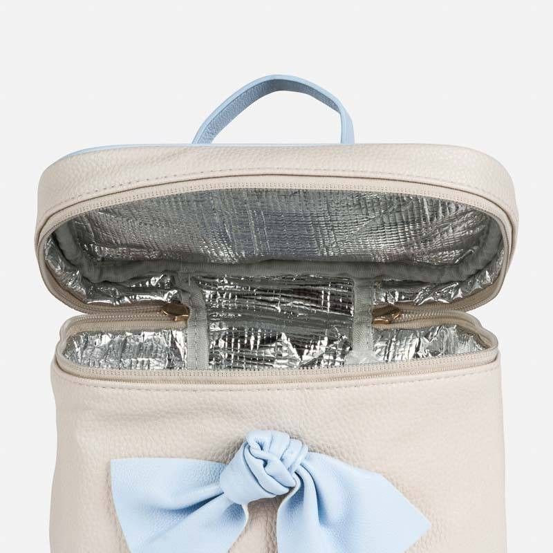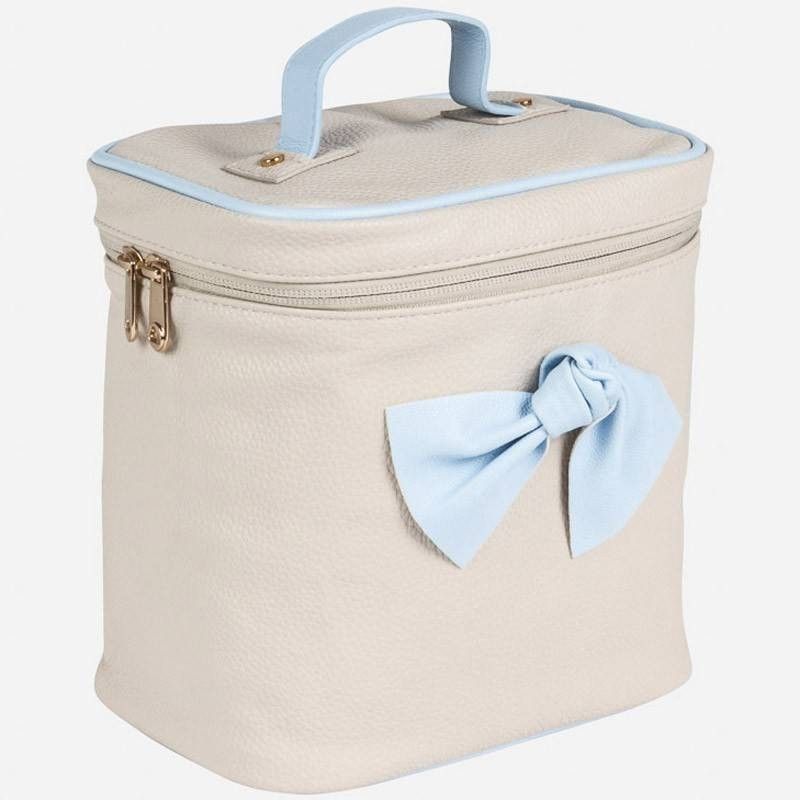 Este práctico refrigerador Classic Moments de Mayoral con un elegante y bello diseño mantiene la temperatura de cualquier bebida o alimento. Está fabricado en polipiel y decorado con un ribete que hace juego con un hermoso lazo que lleva en la parte delantera. Además se abre muy fácilmente gracias a su cierre de doble deslizamiento.