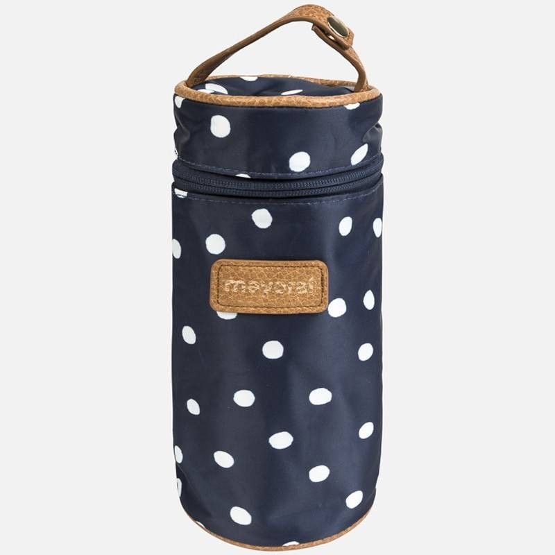 Portabiberón de bebé en loneta y material térmico en su interior que permite conservar las temperaturas, que además cuenta con detalles a contraste en polipiel, cremallera para cierre, asa superior con broche y grabado con el logo de la marca en la parte delantera.