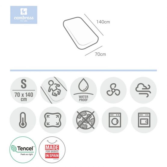 - La sábana ajustable confeccionada con fibras de TENCEL para cuna 70 x 140 cm de Cambrass funciona como una práctica bajera al adaptarse al colchón por los laterales con su goma elástica, es impermeable y transpirable.