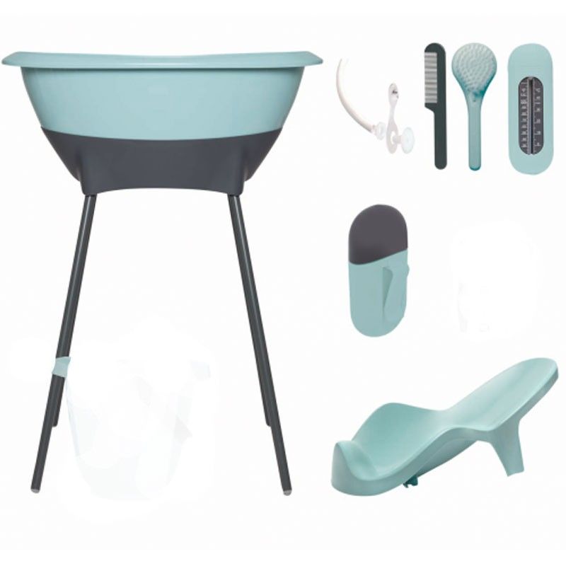 Contiene Siete artículos indispensables para el cuidado diario de tu bebé: bañera, soporte, tubo de desagüe, asiento de baño, cepillo, peine, termómetro de baño.