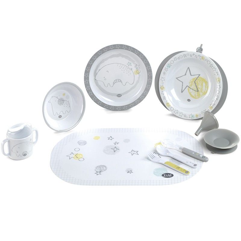 El set contiene: un plato termo con embudo, un bol, un plato plano, set de cubiertos (cuchara, tenedor, cuchara de silicona), taza con asas y tapón extraíble, un salvamanteles y una ventosa para fijar los platos en la mesa.