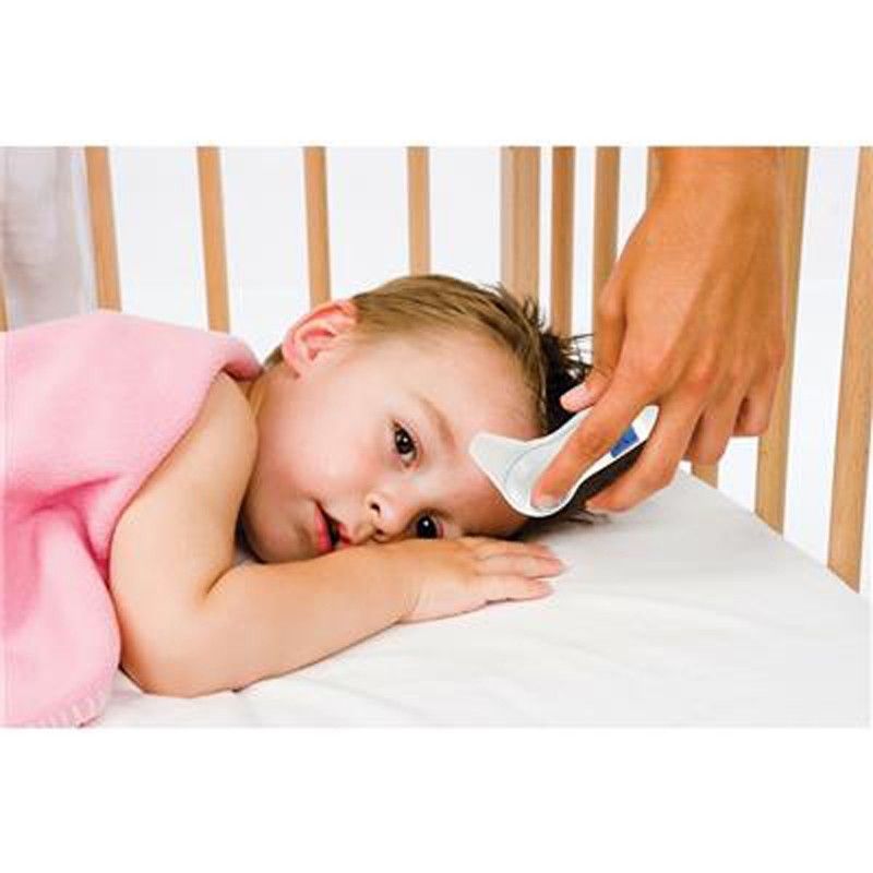 Si tiene un niño pequeño, seguro que está buscando un método sencillo para medir la temperatura del bebé. El rápido termómetro para frente Topcom puede incluso medir la temperatura con total comodidad mientras el bebé duerme. Simplemente sujete el termómetro delante de la frente del niño, y aparecerá una lectura precisa. Si desea obtener una medición más precisa, extraiga la tapa y utilice la sonda para el oído.
